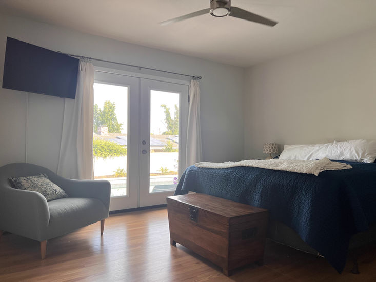 The bedroom has a king bed and French doors out to the pool.